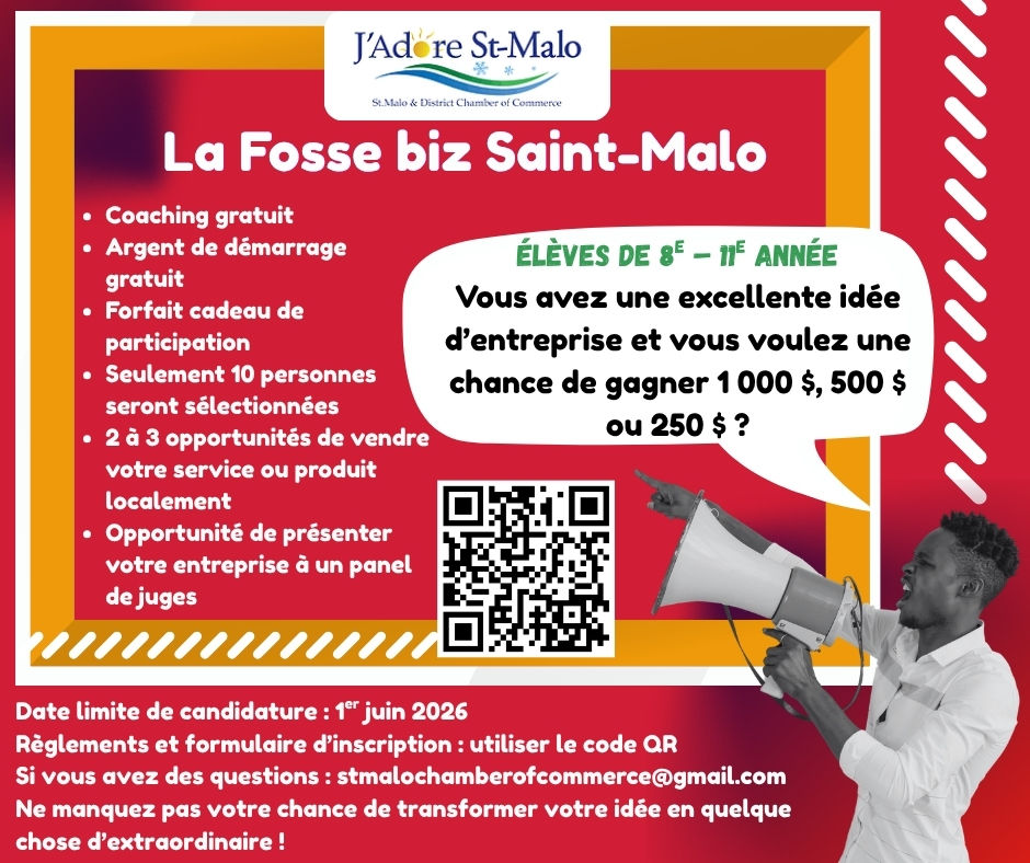 The St. Malo Biz Den is a youth entrepreneurship initiative designed to support students in developing, launching, and pitching their own business ideas. Participants will receive coaching, start-up funding, and hands-on business experience through local sales opportunities, culminating in a final “Dragon’s Den”-style pitch event.